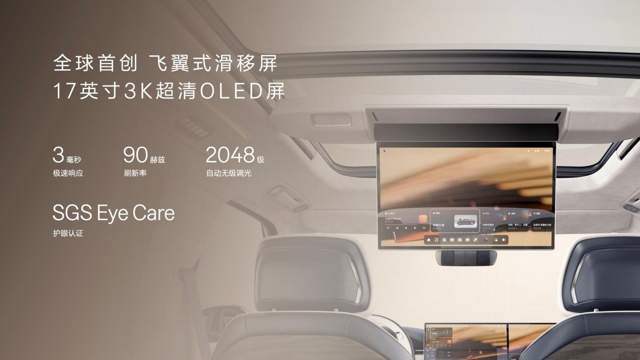 除了顶级音响,极氪9X还带来全球首创的飞翼式滑移屏。这块17英寸3K超清OLED屏由三星供应,可在二三排间电动无级滑移88厘米,并支持5档角度调节,让全车乘员都能舒适使用。其低蓝光的护眼认证,也确保全家观看无忧。