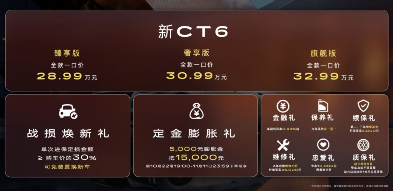 百年积淀,阅尽千帆,凯迪拉克的豪华初心始终如一。新CT6携百万级傲人气场、百万级精奢用料,百万级磁浮底盘以及百万级安全标准,树立豪华旗舰的全新标杆。即日起,用户可前往当地经销商或者登录凯迪拉克官方App、小程序以及抖音“凯迪拉克尊选”直播间下订新CT6,即刻开启执掌人生的新征程。