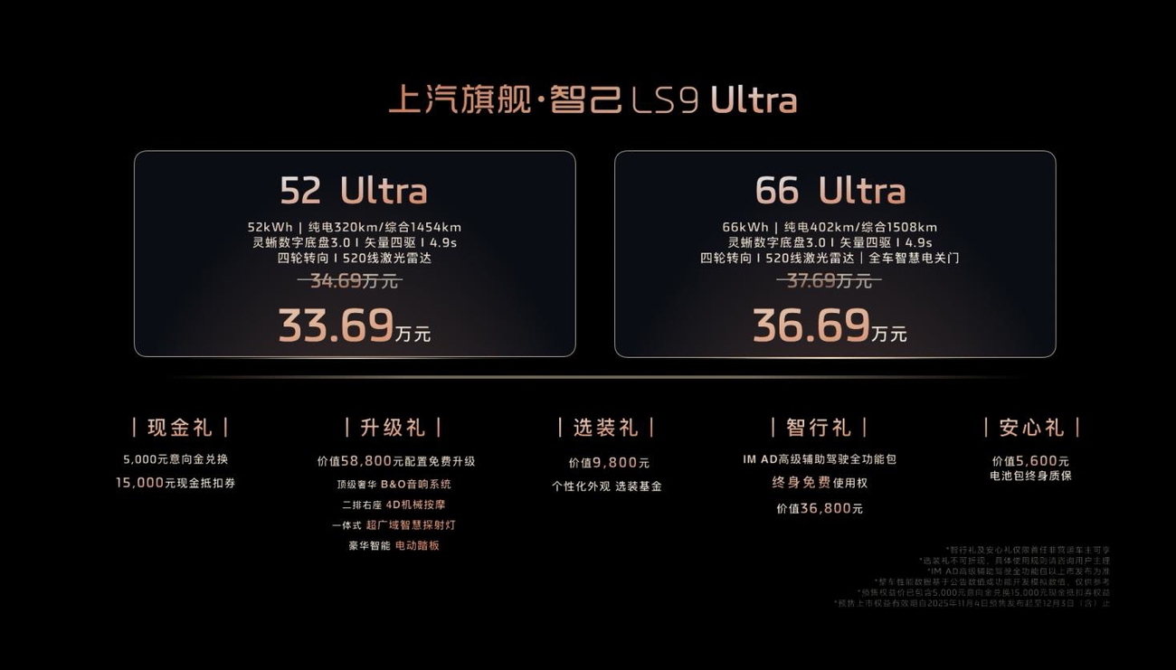 2025年11月4日,上汽旗舰·智己LS9全球首发并正式开启预售。新车重磅首发两个超级增程版本,全系皆Ultra:52 Ultra版,预售权益价33.69万元;66 Ultra版,预售权益价36.69万元。作为汇聚上汽集团70年造车底蕴,集全球顶尖技术打造的旗舰之作,智己LS9以“两大跨代际硬核科技+两大智能时代最强创新”的绝对实力,一举颠覆30万级大六座SUV市场格局,正式宣告9系新王诞生!