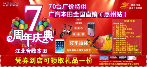 7周年店庆,我们店联合厂家特别推出广本直销(惠州站)专场;惠州一年只能申请一次,一年只有一个店(错过这次只能等明年)
