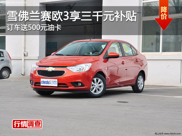 【网上车市长沙站讯 】近日,编辑从九通雪佛兰4S店了解到,近期到店购买赛欧3可享3千元补贴,订车可送500元油卡。感兴趣的朋友可以到店或致电咨询,详询:4008-112233转4043。想获得更多赛欧3优惠的网友可在本文下方“团购报名”填写报名。