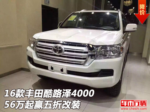 【网上车市 天津滨海行情.原创 】近日获悉,2016款丰田兰德酷路泽4000现车到店56万起赢五折改装,2016款丰田兰德酷路泽4000最新促销价格全新进口揽胜豪华SUV。整车原装进口酷路泽4000高人气越野以其优异的性能成绩向世人证明了巡洋舰家族的实力!2016款丰田兰德酷路泽4000配置丰富手续正规,具体颜色和配置请致电商家咨询,更多优惠尽在天津合源汇通国际贸易有限公司,如您对本车感兴趣,欢迎致电咨询,购车热线; 13752776015 李女士