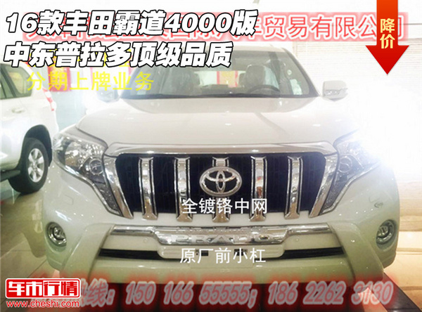 【网上车市 天津滨海行情.原创 】近日获悉,16款丰田霸道4000版中东普拉多顶级品质,天津现车销售价格实惠清爽直降热销,颜色齐全手续正规,更多优惠促销活动请致电天津伟宏业天汽车销售有限公司,机会难得欲购从速,具体详情请与经销商联系,24小时购车咨询电话:15016655555 18622623130