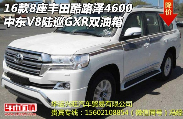 【网上车市 天津滨海行情.原创 】近日,2016款丰田兰德酷路泽4600新车上市六速GXR版中东V8配置参数油耗,大空间8座巡洋舰提车首付三成,购车手续齐全随车带走;双油箱丰田兰德酷路泽4600黄金八月降价,八月最新进口车行情,了解更多平行进口车资讯尽在天津华运兴旺汽车贸易有限公司,一手贸易商拒绝中间加价真实车源手续完善,质量保证,购车可日办理上牌业务异地可上牌,感兴趣的朋友不妨到店详询!旗舰贵宾专线:冯经理:15602108854(微信同号) 具体车型以及价格如下: