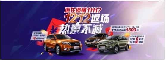 【网上车市合肥站 商家新闻 】双十一购物节之后,消费者纷纷对北汽幻速的优惠力度点赞,希望北汽幻速今后能够多开展类似的促销活动。现在,北汽幻速响应消费者的殷切期盼,天猫双十二狂欢节又将掀起新一波的购物热潮,让本次钜惠更为“给利”!12月4日—12月12日期间,登录天猫北汽幻速官方旗舰店,尊享三重优惠大礼,驾驭“幻速奇迹”!