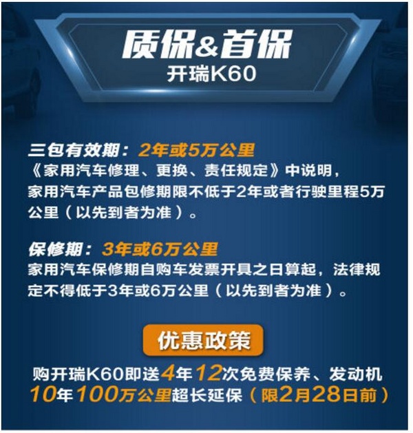 根据上述数据显示,开瑞K60的用车月均成本在588元左右。目前,开瑞汽车推出福利除2月28日前购买开瑞K60送4年12次免费保养外,还有机会享受国家正常的购置税减免政策以及送发动机10年100万公里超长延保等福利,最高能省5262元。不仅购车优惠了、用车安全了、养车也更加实惠了。