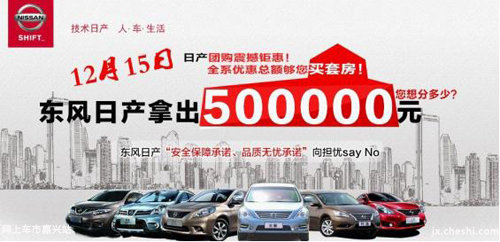 【网上车市嘉兴站讯 】年关将至,想必您还有很多的心愿还没完成吧,还在为资金的事而烦心吗?现在告诉您一个好消息,为感谢广大车主对东风日产的信任,东风日产拿出五万元,给您在2012年的最后时刻钜惠,届时12月15日嘉兴康桥将在店中举行盛大的年底全系团购钜惠,并且全系优惠金融总额高达五万元,到时您想分多少呢?